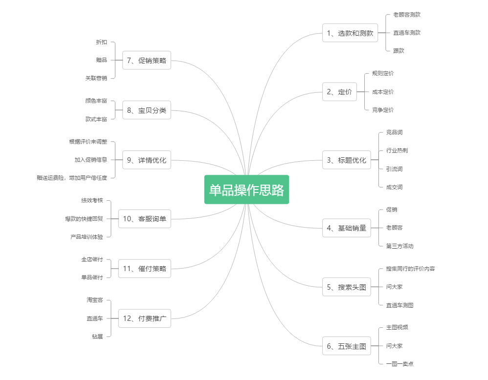 这就是我认为单品操作里面要涉及的12个点。建议大家把每个单品的12个点,一个一对一的去做一个excel表格,罗列出每一点的现状以及改进措施,还有竞争对手的数据也是需要罗列出来的。这12个点做完之后,我保证这个产品基本上能做到70到80分,剩下的就是看你在操作时候能不能做到某一个点比对手更好,来实现这个产品的一个提升。 |